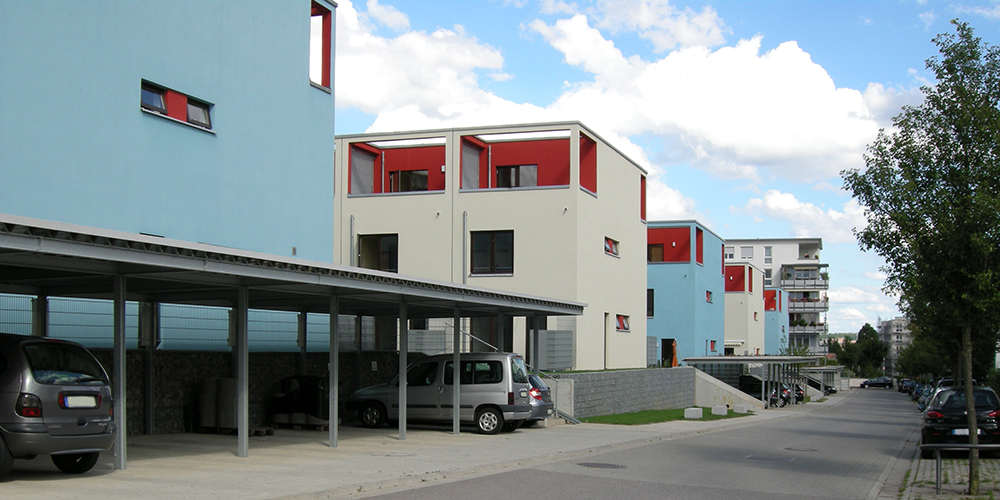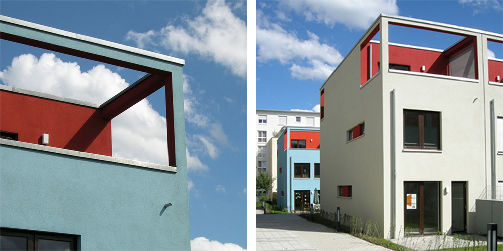 Die Häuser bestehen aus einzelnen Kuben, aus diesen Kuben werden einzelne Elemente, wie etwa Dachterrassen, herausgeschnitten und zum besseren Verständnis der Entwurfsidee farblich abgesetzt. Die kurze Bauzeit von vier bis fünf Monaten wird durch ein hohes Maß an Vorfertigung erreicht: Die im Werk vorgefertigten Ziegelwände, die bereits innenseitig verputzt sind, müssen vor Ort nur noch aufgestellt und miteinander verbunden werden.